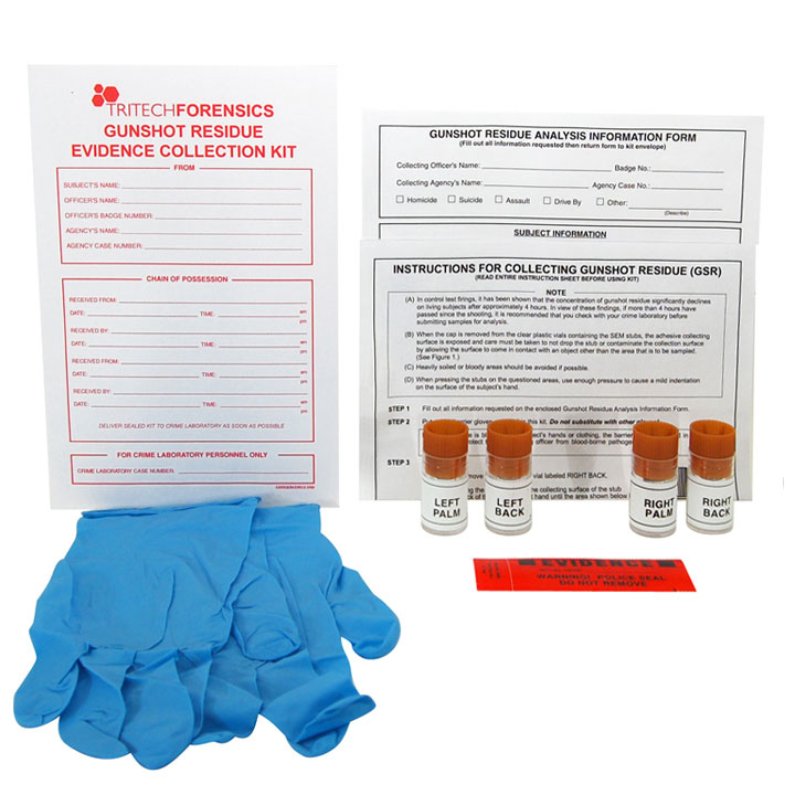 designed for law enforcement agencies whose crime laboratories use SEM (Scanning Electron Microscopy) as their method of GSR analysis|allows collection of "Right Back", "Left Back", "Right Palm", and "Left Palm" samples|kit components: (1) 6"x9" tamper-evident, pre-sealed kit envelope; (1) step-by-step kit instruction sheet; (1) gunshot residue analysis information form; (1) pair of disposable plastic gloves; (1) ea. right and left back vials w/ cap containing SEM stub covered w/ double-sided adhesive carbon tape; (1) ea. right and left palm vials w/ cap containing SEM stub covered w/ double-sided adhesive carbon tape; (1) tamper-evident police evidence seal for resealing kit after evidence collection